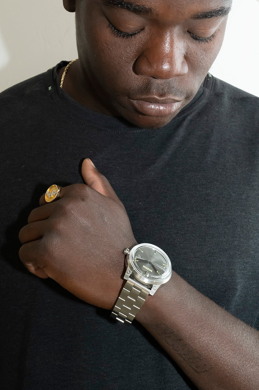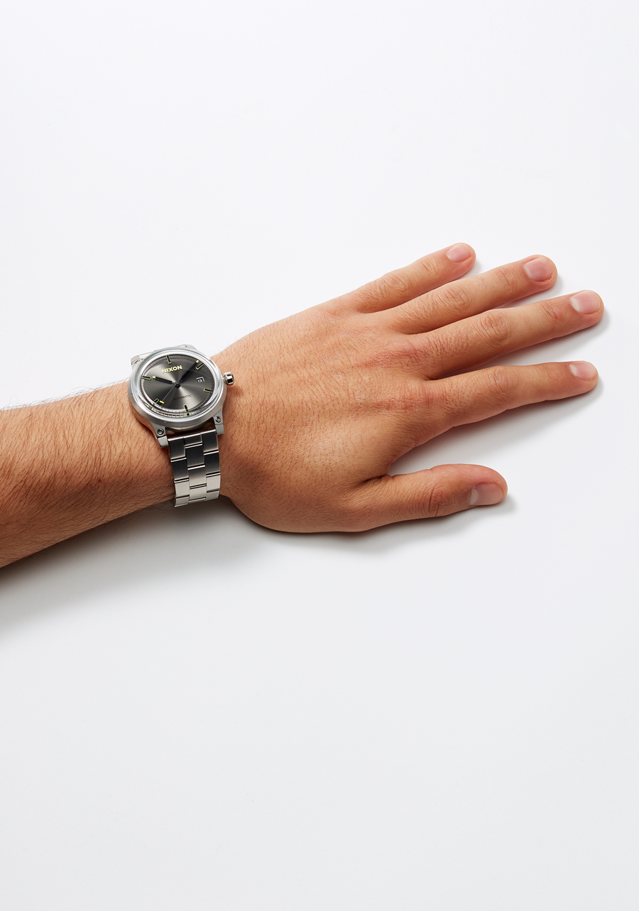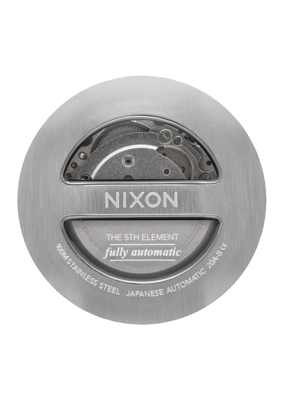 The unique two-piece design eliminates the need for a traditional caseback, while the split window gives a view of the inner workings of the automatic movement and the custom crystal shape flows seamlessly into the case with angled edges. The domed dial features LUME block indices and LUME accents on the hands for visibility even in low light conditions.