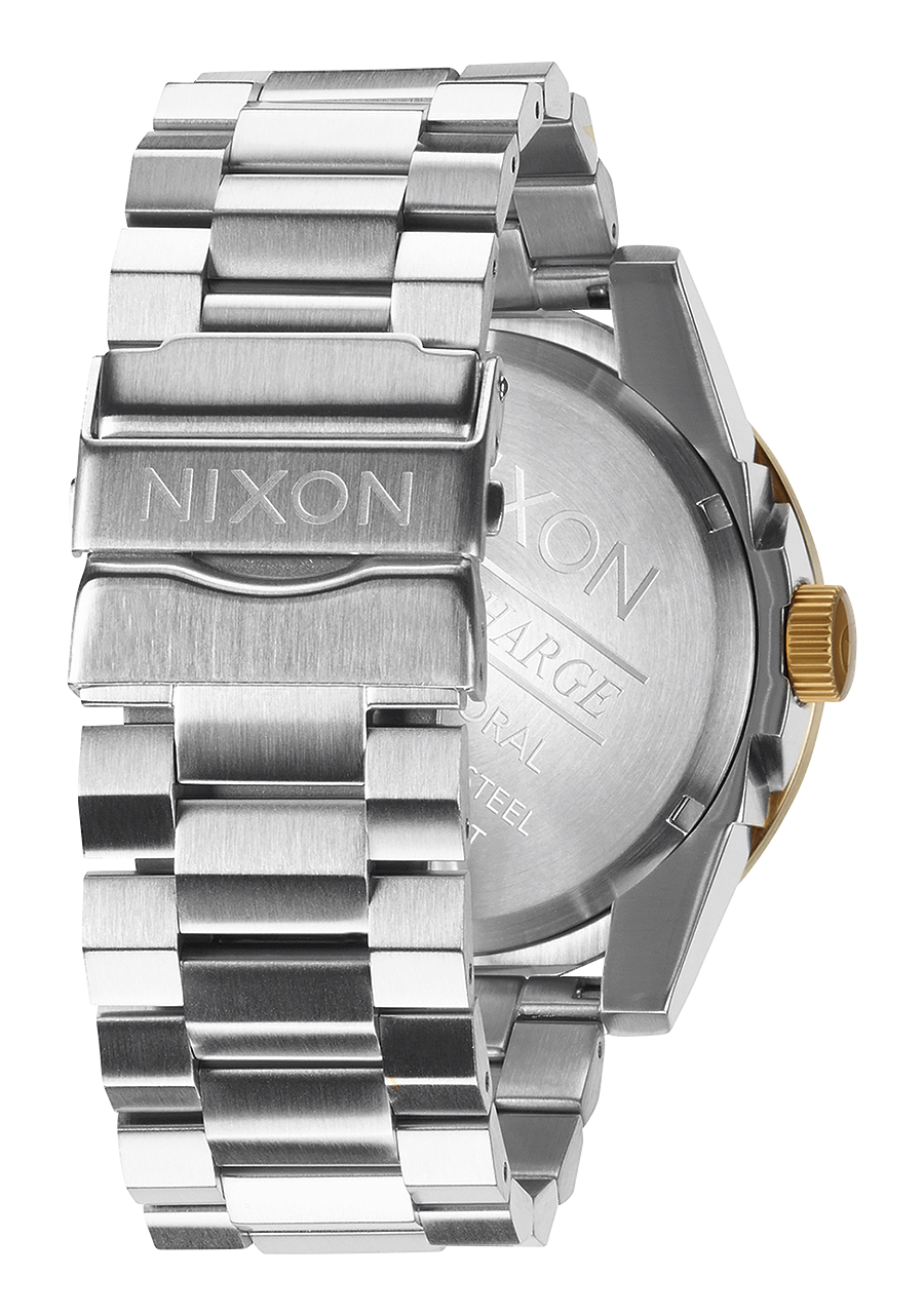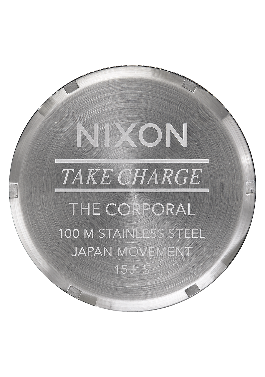 The Nixon Corporal features a 48mm custom solid stainless steel case, a solid stainless steel fixed bezel, and a hardened mineral crystal.