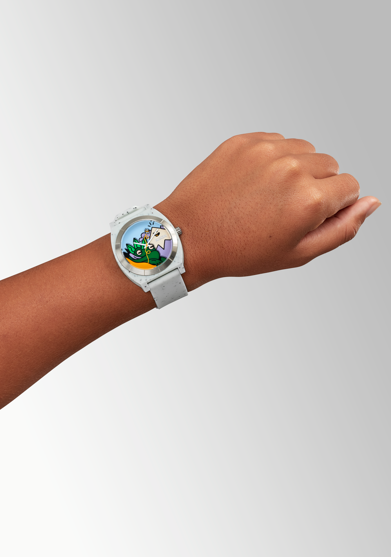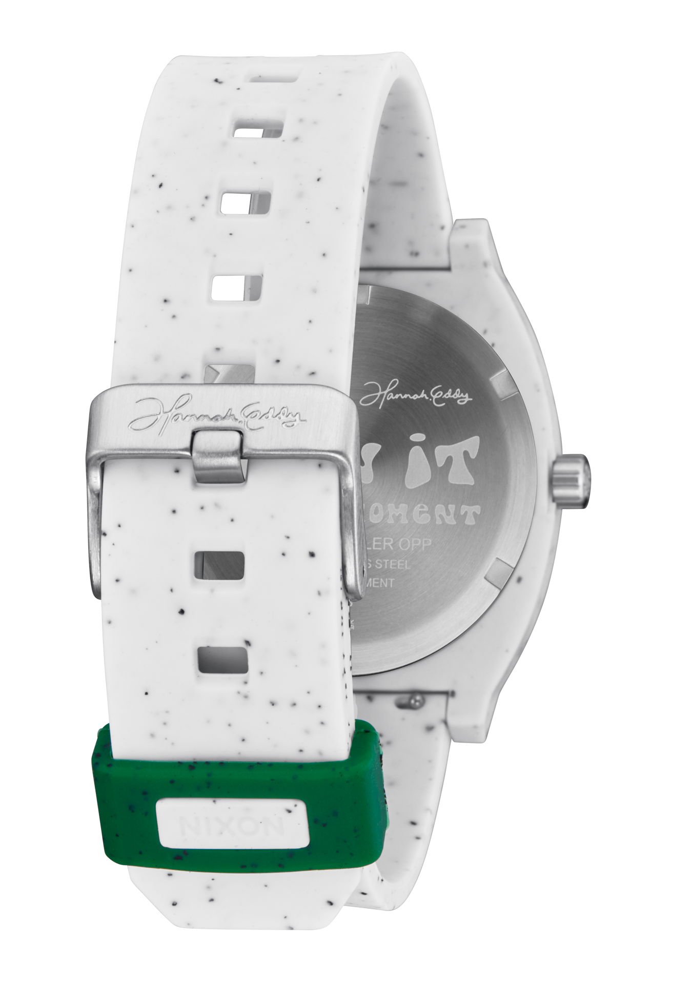 39.5mm recycled plastic watch case and solid steel fixed bezel with a 100 meter / 10 ATM water rating. Includes a hardened mineral crystal, triple gasket stainless steel crown, stainless steel screw down caseback and spring pin lugs.