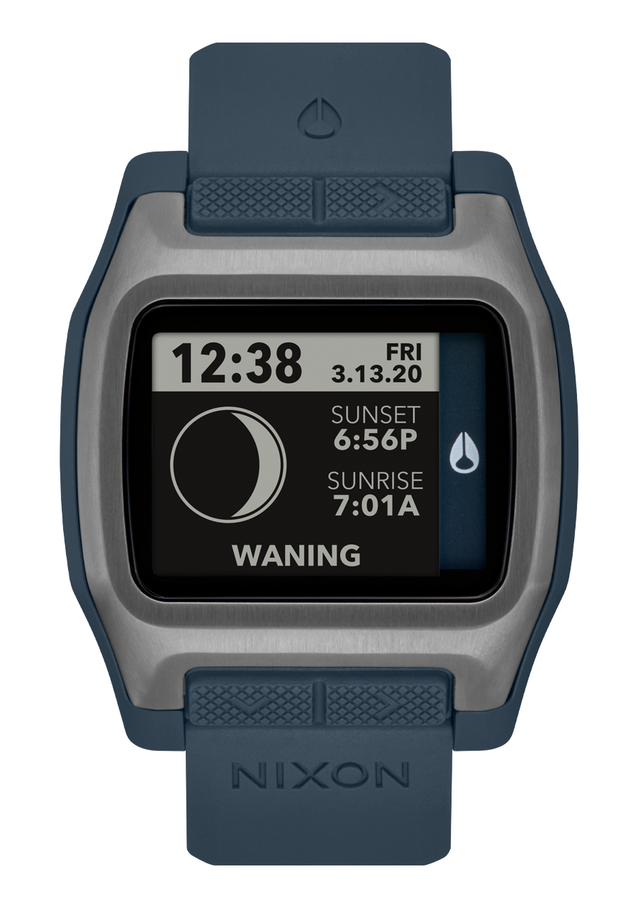 Custom digital module with high-resolution MLCD with front light, 550 pre-programmed beach locations with precise tide, sun, and moon data, chronograph with action time stamp and countdown timer.