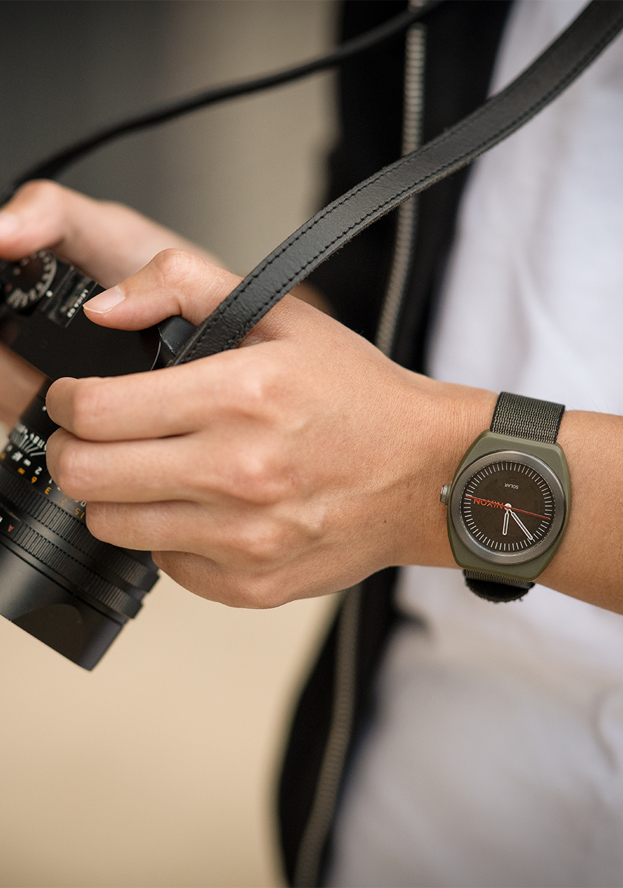 The Nixon Light-Wave watch features a 36mm case diameter made from recycled ocean plastic, with a stainless steel caseback. It includes a 20mm custom recycled ocean plastic woven strap. The dial showcases a semi-transparent dial and a unique design that highlights the solar panel within the watch face.