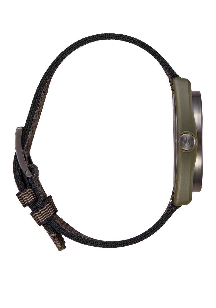 36mm custom recycled ocean plastic injection molded case with a 100 meter / 10 ATM water rating. Comes with a stainless steel caseback.