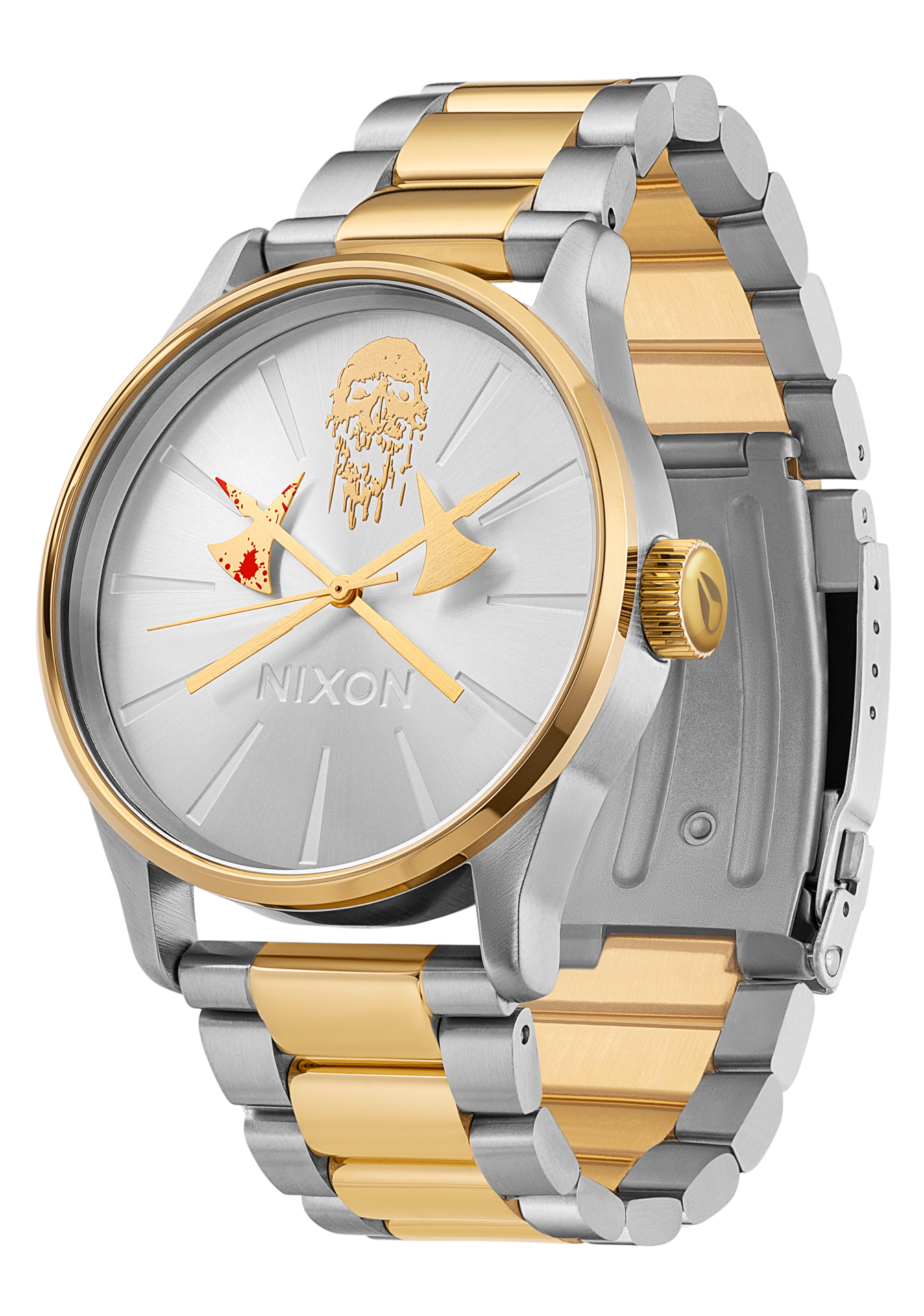 Liquid Death and Nixon introduce a watch for the 0.1%: the Death Clock II. Each of the gold links in its band are hand-assembled by fairtrade demons who were raised exclusively on a diet of black acorns. And the golden axes to represent the hours and minutes were forged in a river of blood deep inside the Glorgoroth Mountains.