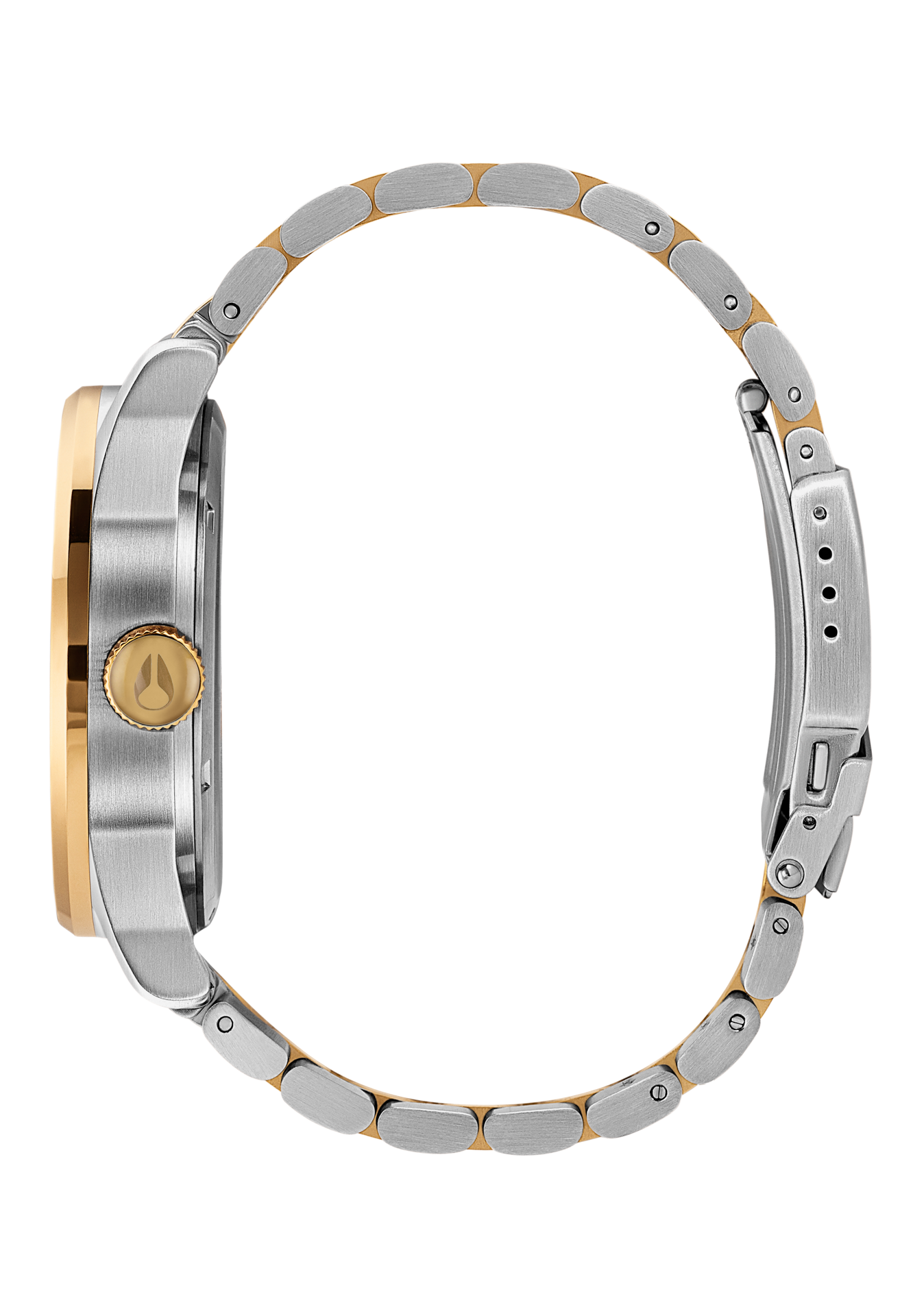 23-20 mm tapered custom, dual color, solid stainless steel 3-link bracelet with stainless steel double-locking clasp and micro adjust.