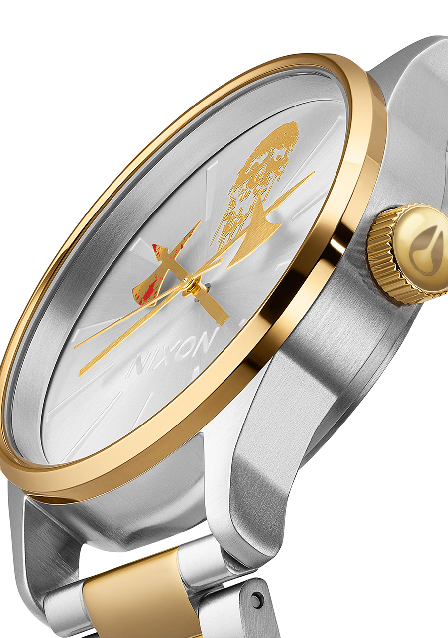 The dial features etched indices, an up-printed and polished Gold Skull, and custom molded hands with dripping blood accents.