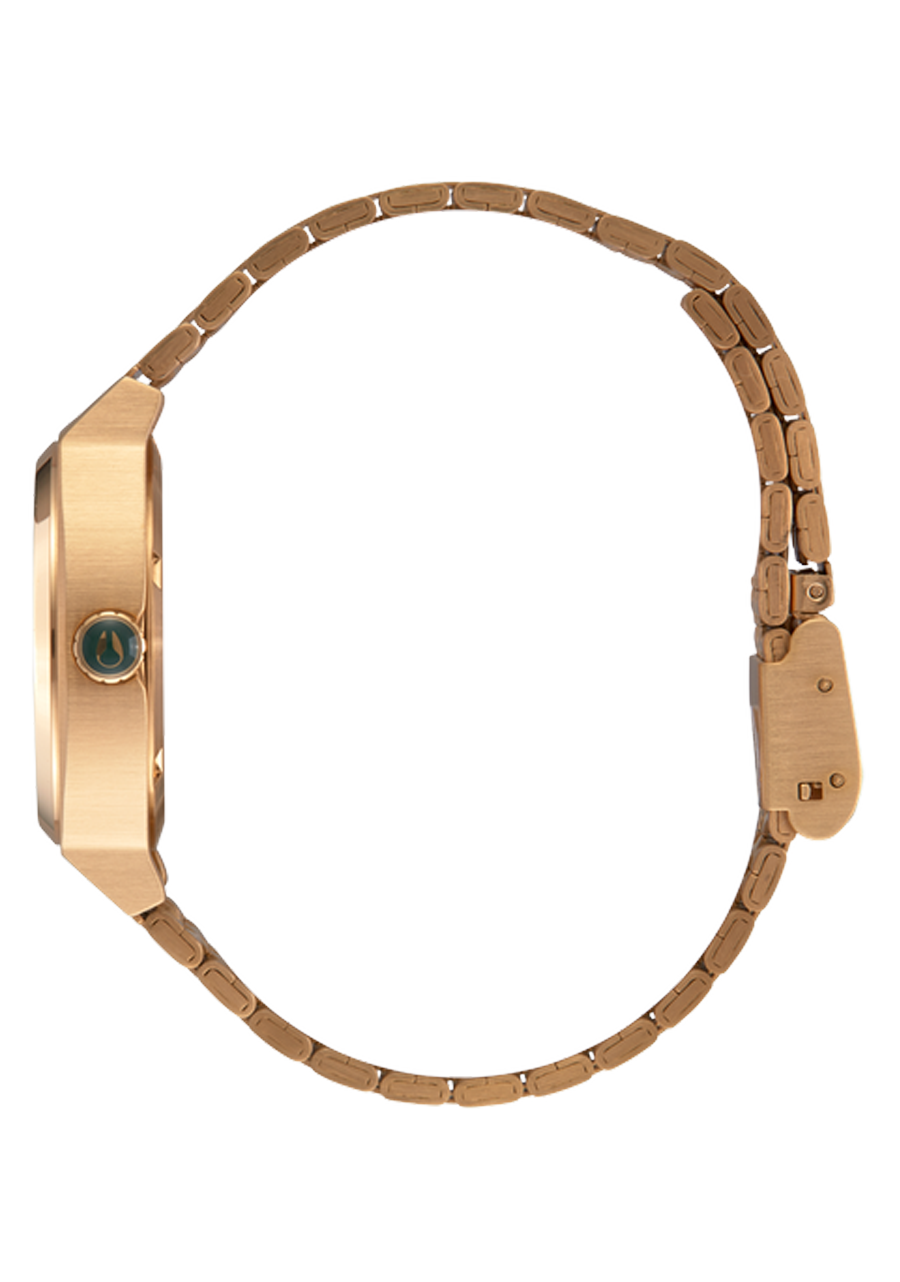31mm custom solid stainless steel case and fixed bezel with a 100 meter / 10 ATM water rating. Comes with a hardened mineral crystal, triple gasket stainless steel crown, stainless steel screw down caseback and spring pin lugs.