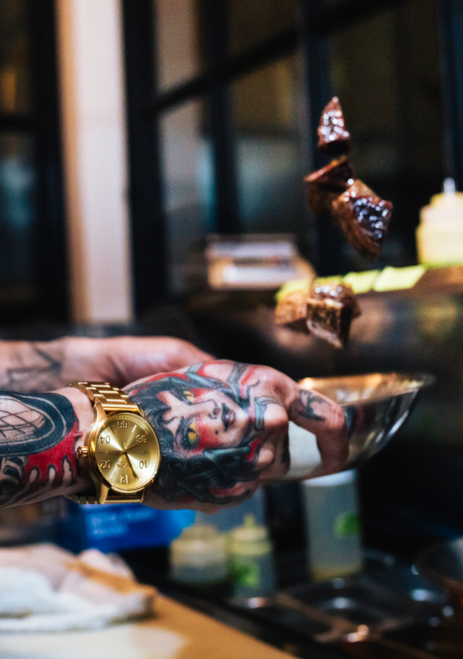 The Nixon Patrol watch features a dial with applied indices, a dial ring with a printed seconds track, and custom molded hands. The other ring on the watch dial includes a 24-hour time format.