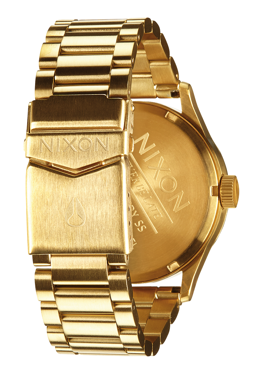 The Nixon Sentry Stainless Steel Watch is water resistant with a rating of 100 meters / 10 ATM. It is suitable for activities like swimming and surfing.