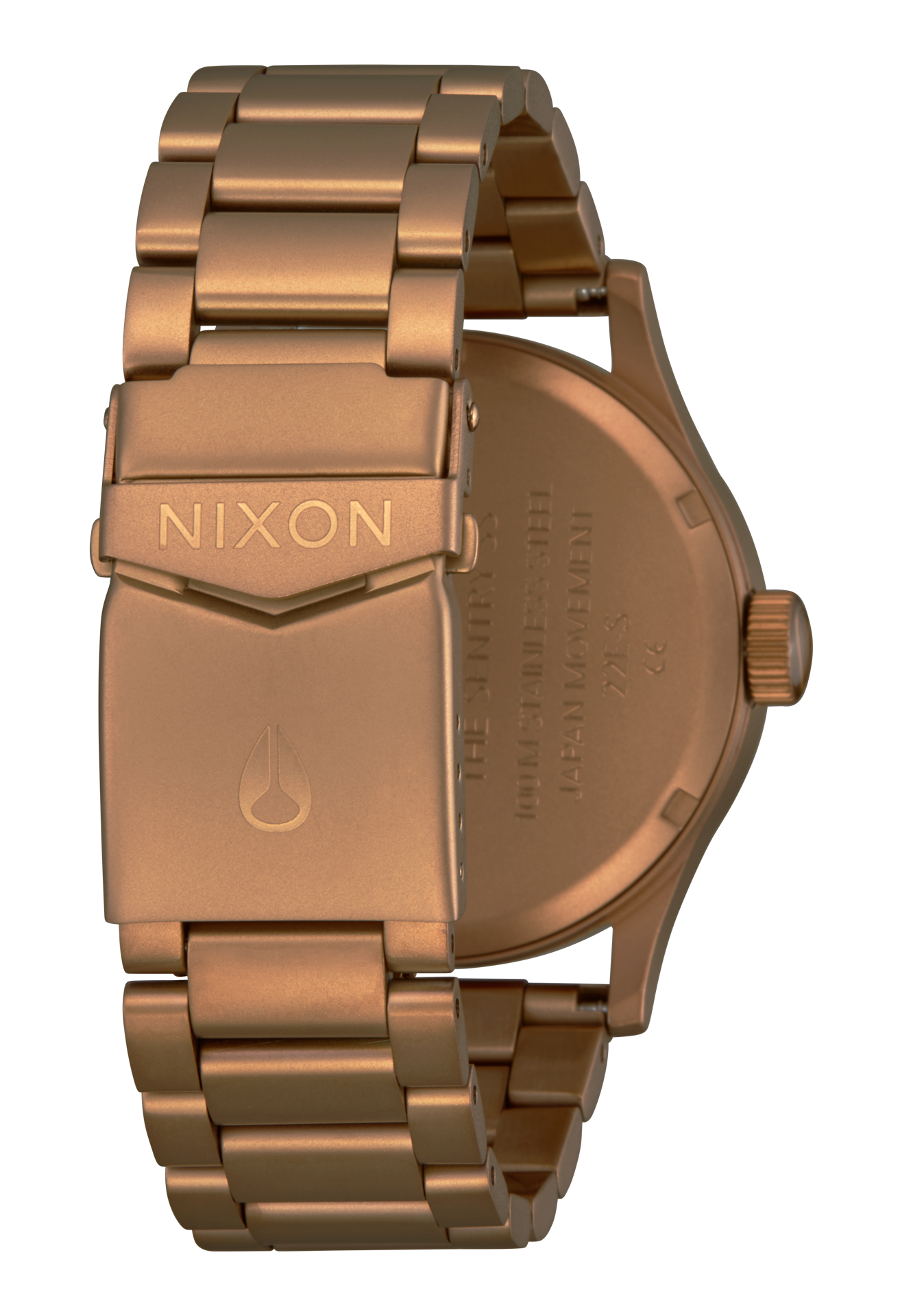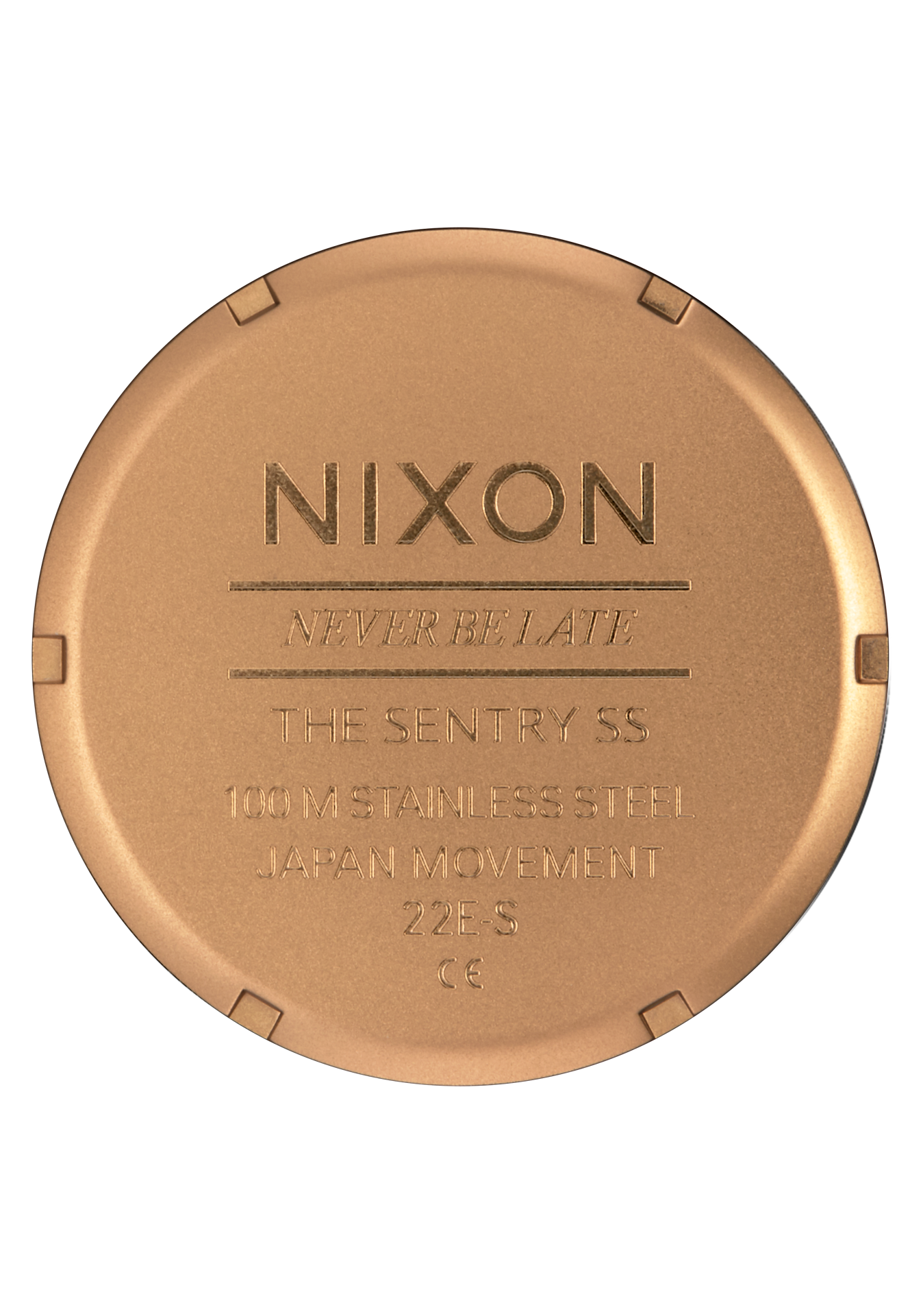 The Nixon Sentry Stainless Steel watch uses a Japanese Miyota 2305 quartz 3-hand movement and features a bilingual day and date function in English and Spanish.