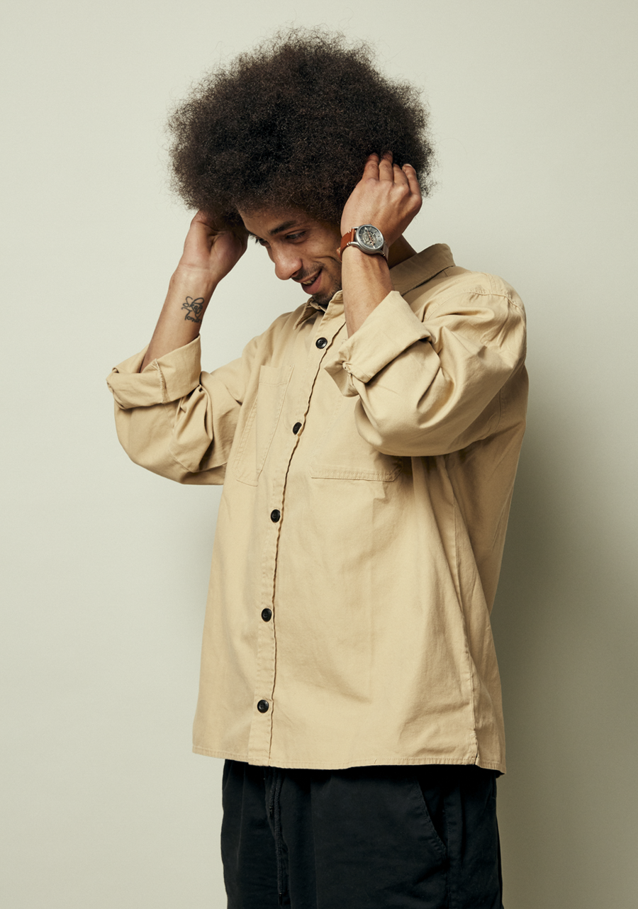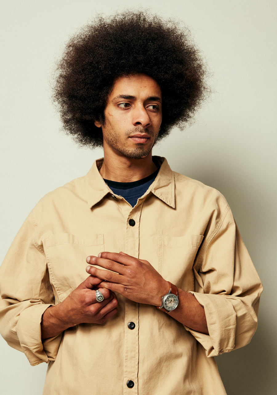 40mm custom solid stainless steel case with a 100 meter / 10 ATM water rating. Comes with a bold crown with fine coin-edge texture, slightly domed crystal design, and a screw down caseback with a window into the automatic movement.