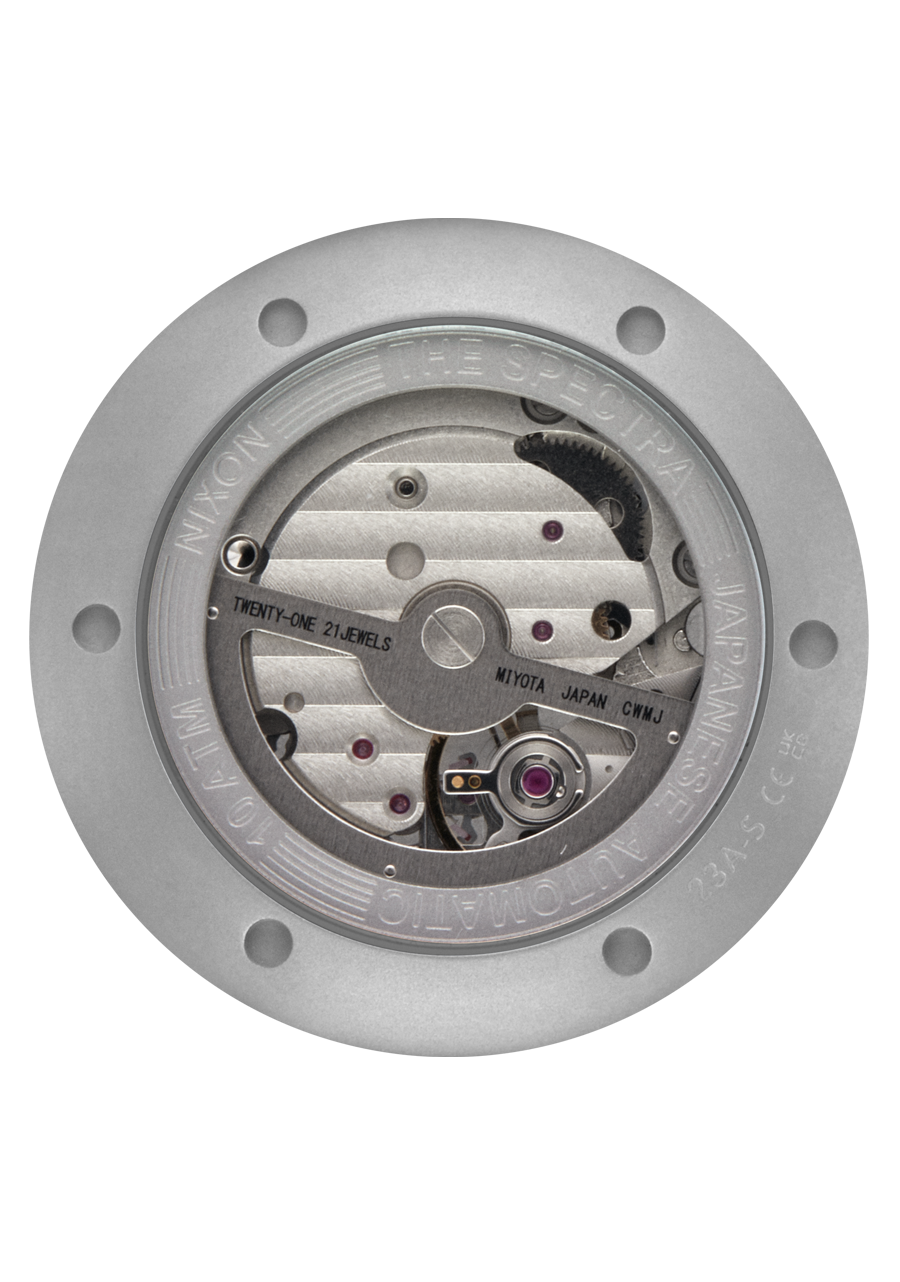 The Spectra Leather sits exquisitely between defying tradition and paying homage to the classic art of watchmaking. Its twenty-one jewel automatic movement is fully displayed through the spectacular transparent skeleton face, punctuated by striking indices and the Nixon wordmark that appears to float above it all. It's daring, dimensional, and drops jaws anywhere it goes.